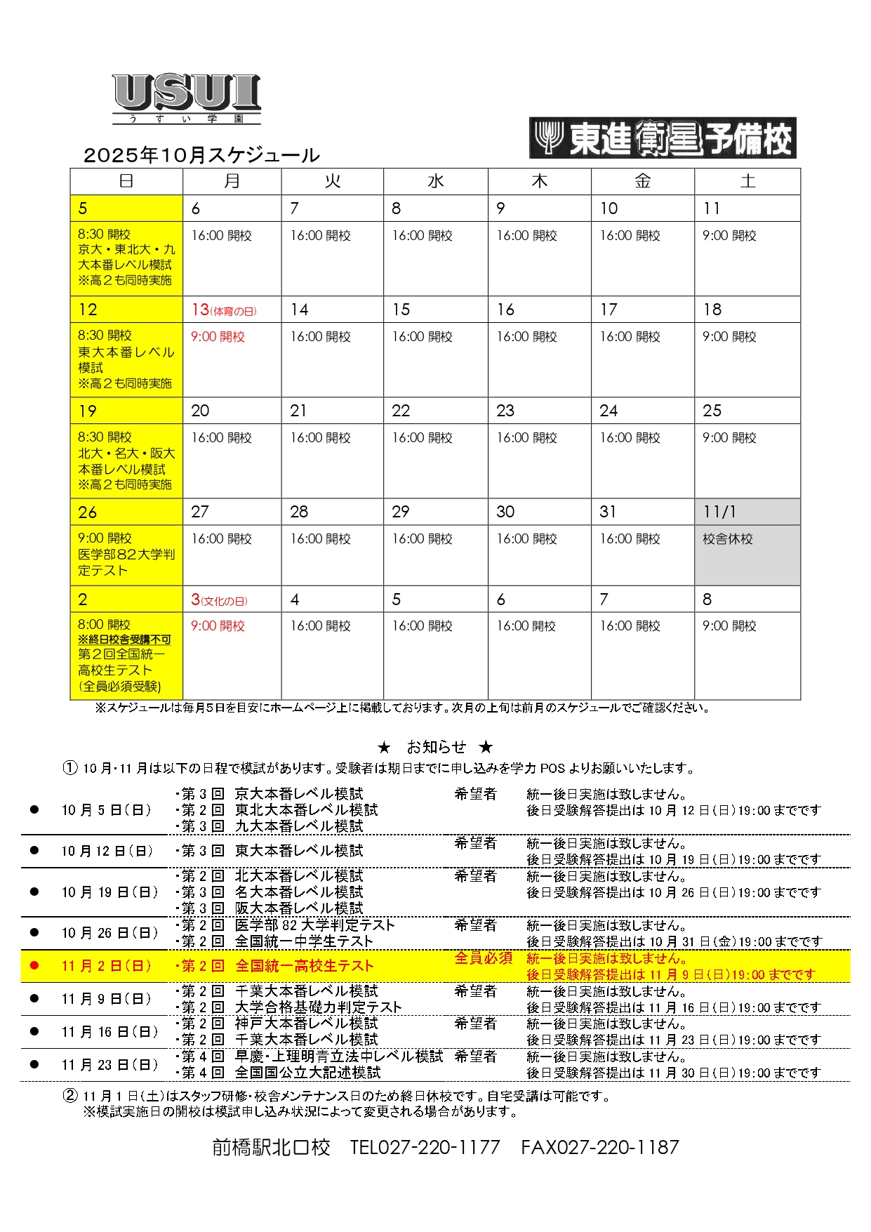2025年10月前橋駅北口校スケジュール(拡大版はこちら)