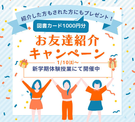 お世話になっております。 年中さん~小学6年生を対象に、「無料体験授業」を実施しております! 周りに塾を探している、新しい習い事を検討している方がいらっしゃいましたらこの機会にぜひご紹介ください また、友人紹介キャンペーンとして、 ご紹介いただいた方が実際に授業を体験された場合 ・体験授業に参加されたお友達 ・今回の授業を紹介した塾生 それぞれに図書カード1000円分をお渡しいたします!