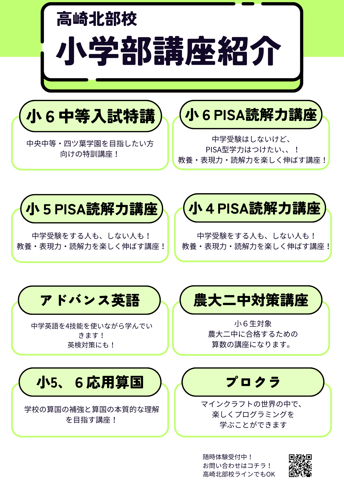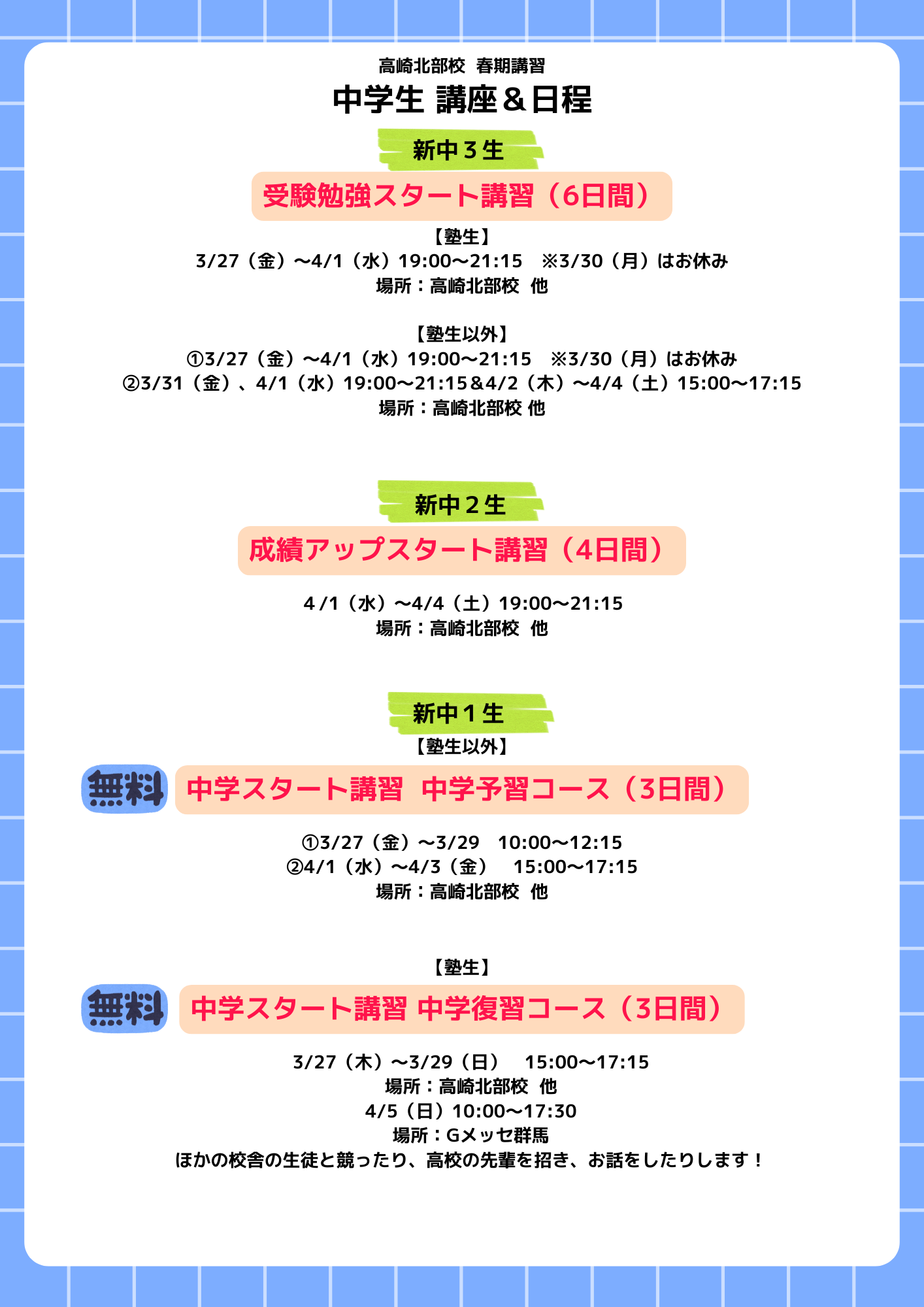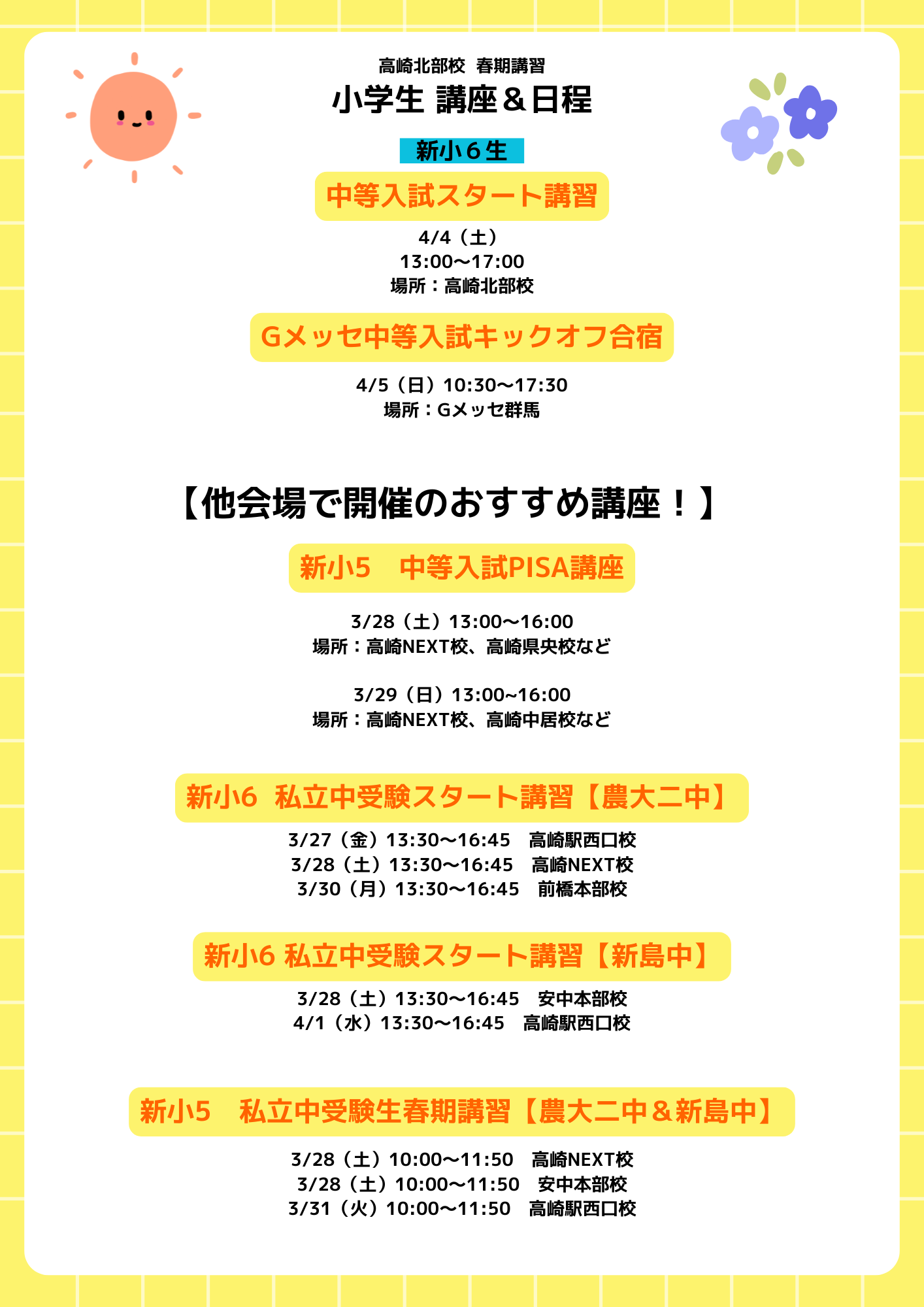 高崎北部校では、校舎の最新情報(季節講習や無料体験授業などのキャンペーン)のお知らせや、