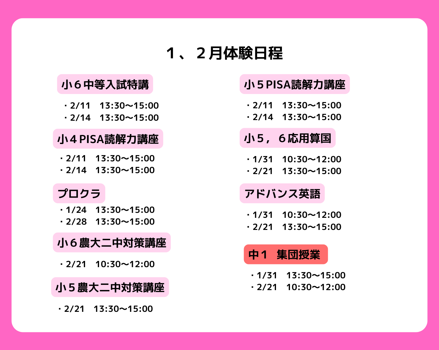 算数や国語など教科の学習では対応できない中央中等・四ツ葉中等・太田中学入試に向けた対策講座です。