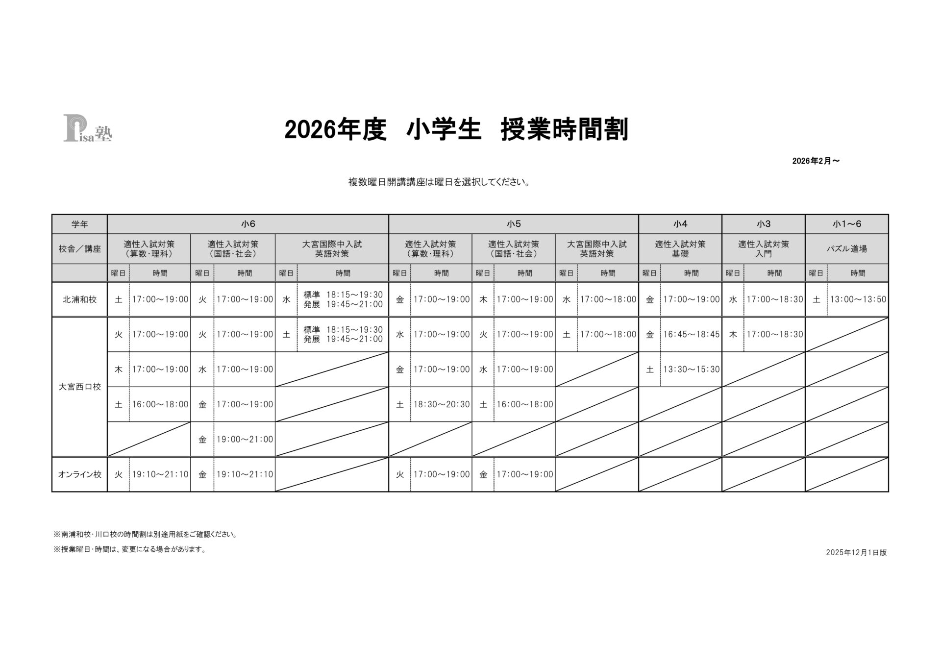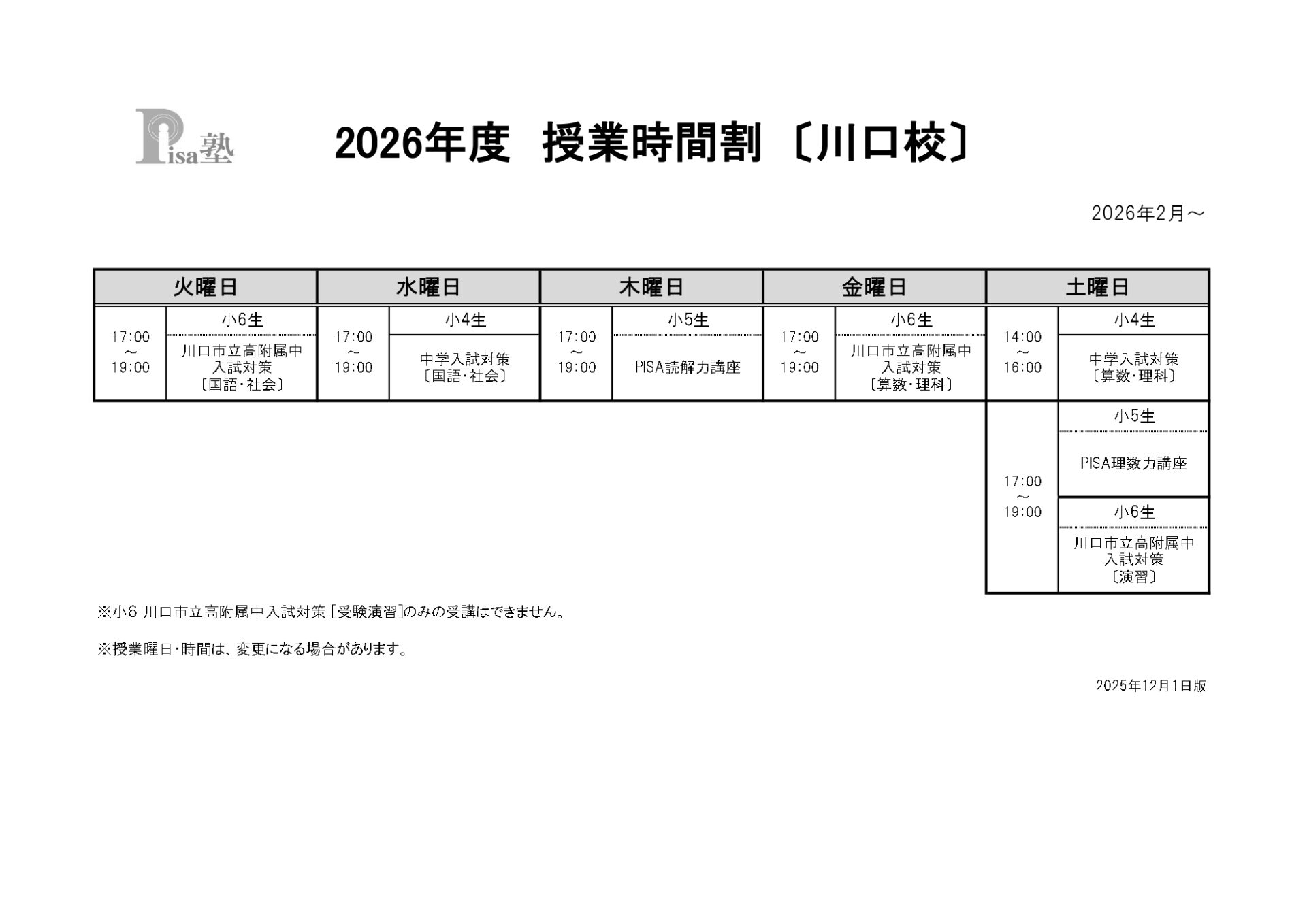 2026年度 PISA塾時間割