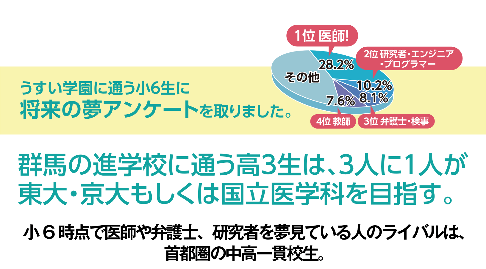 東京大学も2025年度入試の合格者3014名中、1都3県出身者は1741名で57.8%、群馬出身者は30名で1%でした。小6時に医師や研究者を目指している人が勝負する相手は首都圏の中高一貫校生と言えます。