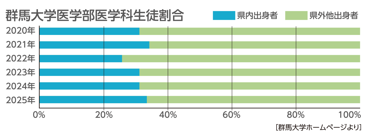 例えば、わかりやすいのは群馬大学医学部医学科です。群馬大学ホームページの資料によると群馬県出身者は在籍の30%ほどで、大多数が首都圏の出身者になります。
