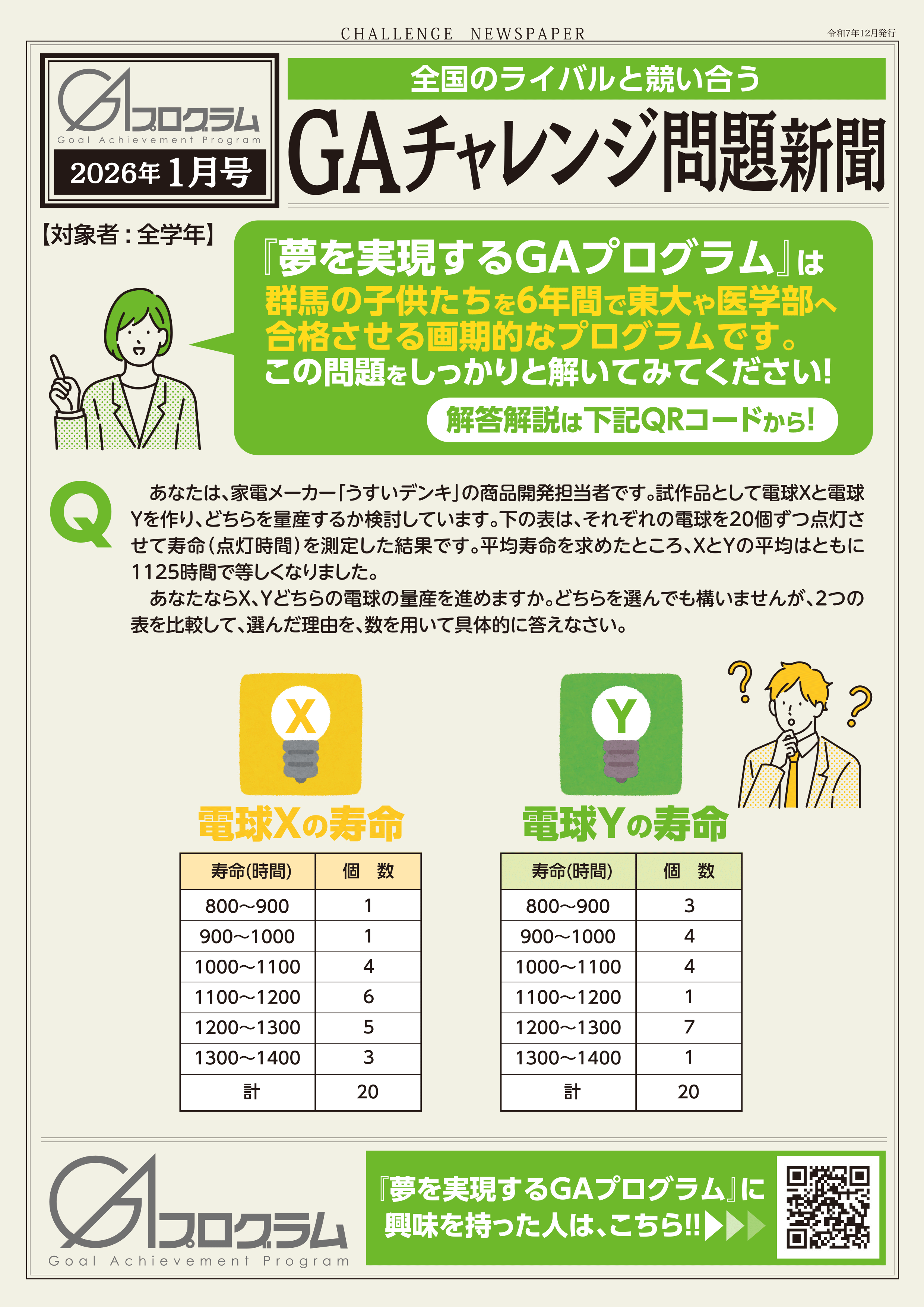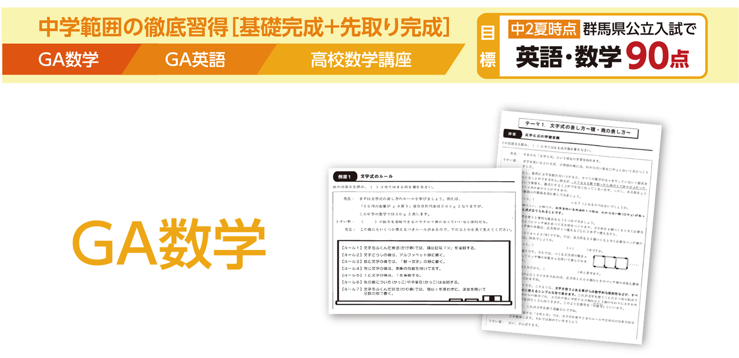 首都圏の中高一貫校と同じペースで数学を履修します。方程式や関数、図形など大学受験数学の土台となる中学範囲を体系的に学びます。中央中等の特進クラスも担当する精鋭講師が学習の取り組み方から指導し、中2時点で群馬県公立高校入試で県内進学校合格レベルの90点を目指します。また月1回ほど高校数学講座という特別クラス※があり、中1から高校数学に触れることができます。将来的にどんな勉強が必要になるのかを感じ取り、成長の指針にしてください。