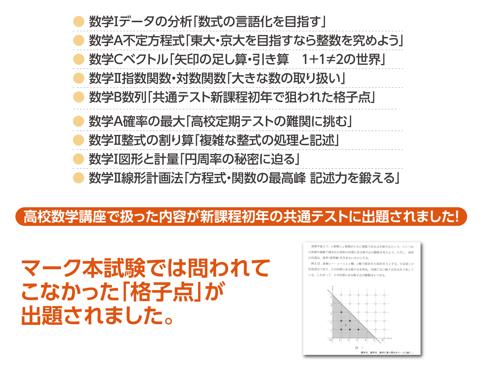 数列は「漸化式」「群数列」など対策すべきテーマが多く、全国の塾の共通テストの対策講座でもなかなか対策に手が届きません。「先取り学習」をして、「難関大学の記述対策」をしている生徒が有利なテストになりました。