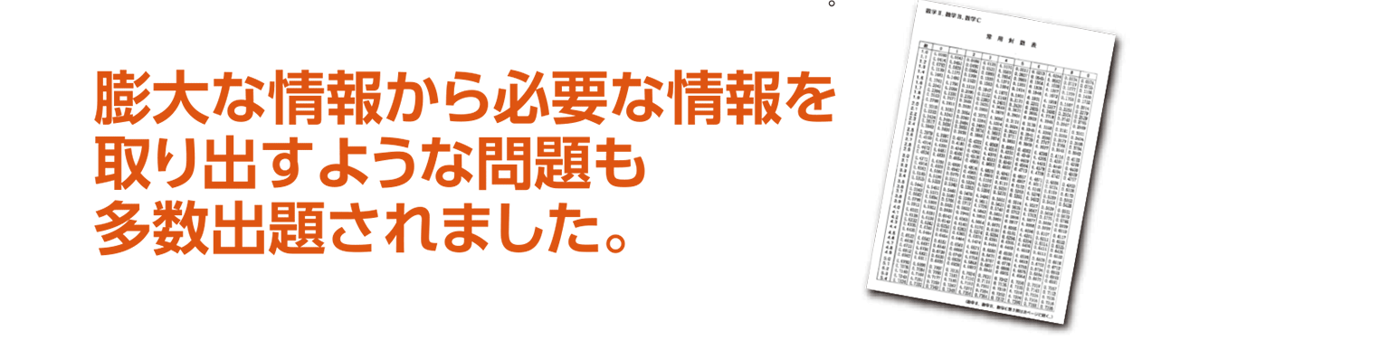 対数関数のテキストで掲載した常用対数表が2ページにわたり掲載されました。同じ数学ⅡBCの共通テストで、正規分布表が掲載されるなど、表だけで丸々3ページが使われました。数学を本質的に理解し、問題から誘導や背景などを読み取る力が試されることになりました。