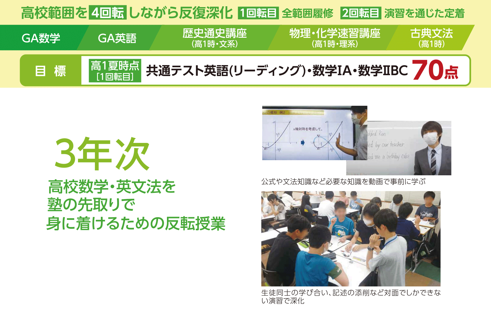 英語と数学は高校入試レベルを突破し、高校内容に入っている段階です。(高校入試があってもなくても、内容の前提になる)高校内容を塾の先取りだけで身に着けるため、反転授業を導入していきます。生徒は受け身でなく、主体的に学ぶことができ、また塾で習った範囲は自ら問題演習を進められるようにしていきます。内容の前提となる中学範囲の理科・社会は、中3のうちに集中的に演習をして身につけます。