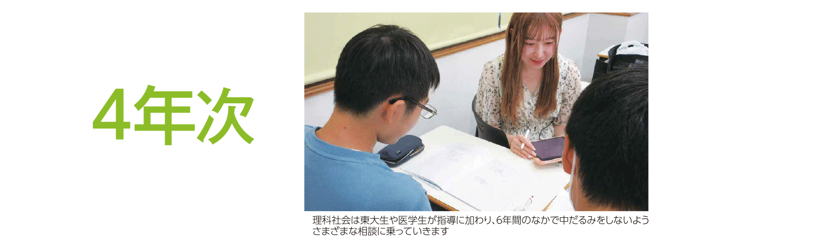 歴史と同様に、学校で理科の教科書が終わるのは高3の10月〜11月です。数学は数学Ⅲだけに固執せず、数学ⅠAⅡBCと並行して塾で演習をし、力をつけます。理科は速習コースがあり、高2のうちに物理化学の全範囲を学び終えることで、高3から過去問演習に入ることが可能です。