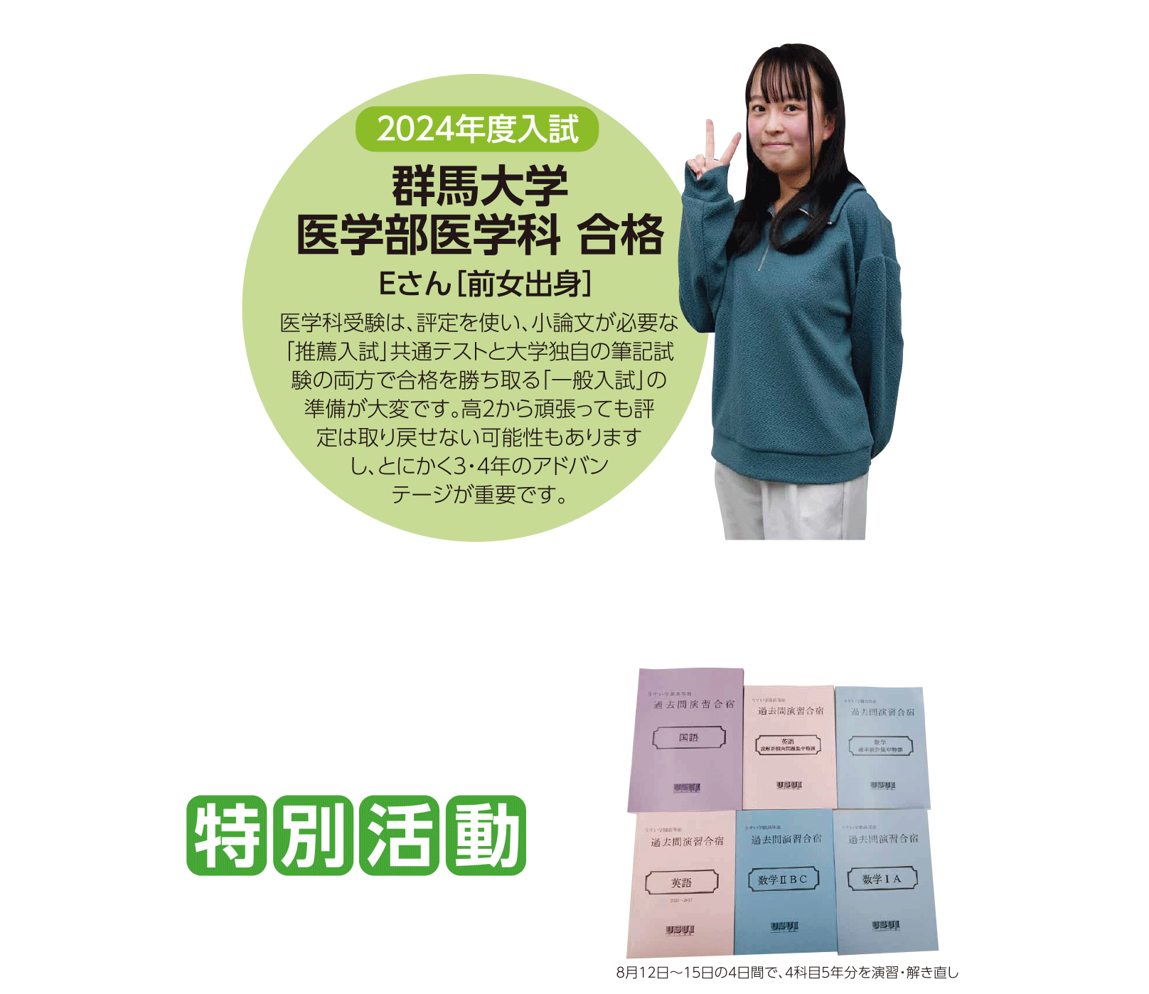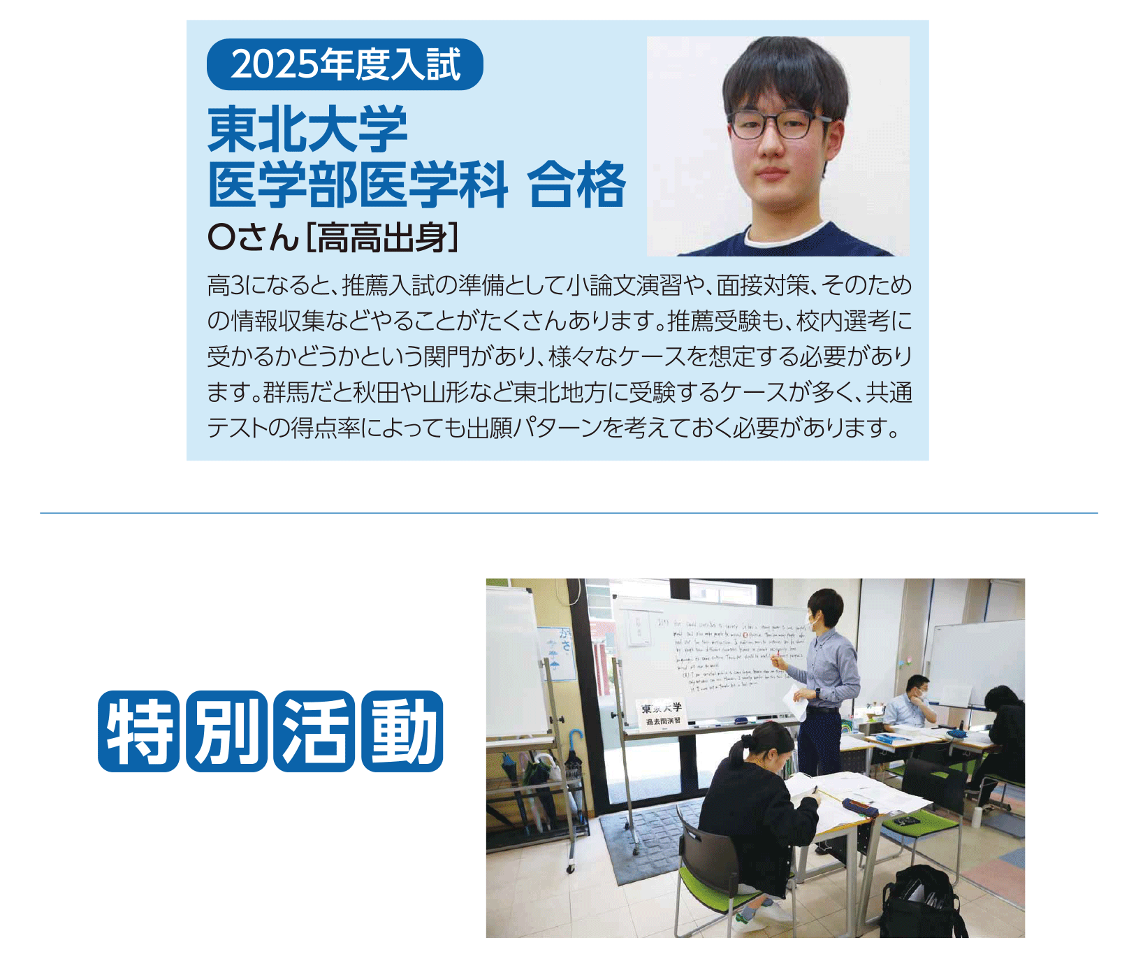 うすい学園は、遠方の東大生や医学部生とオンラインで連携し、指導に活用しています。他にも多くの東大生・京大生・一橋生・医学部生が在籍し、毎週指導してくれています。春合宿や夏合宿では、北海道大・名古屋大・筑波大・東北大・金沢大・千葉大など医学部生に限らず、30〜40名の大学生が駆けつけてくれます。「いつでも、どこでも」だけがオンラインの利点ではありません。文系の早慶大対策や、理系の医学部小論文指導など、細かなニーズにも対応し、また群馬の高校の実情を知り尽くした先輩だからこそできるアドバイスがあります。