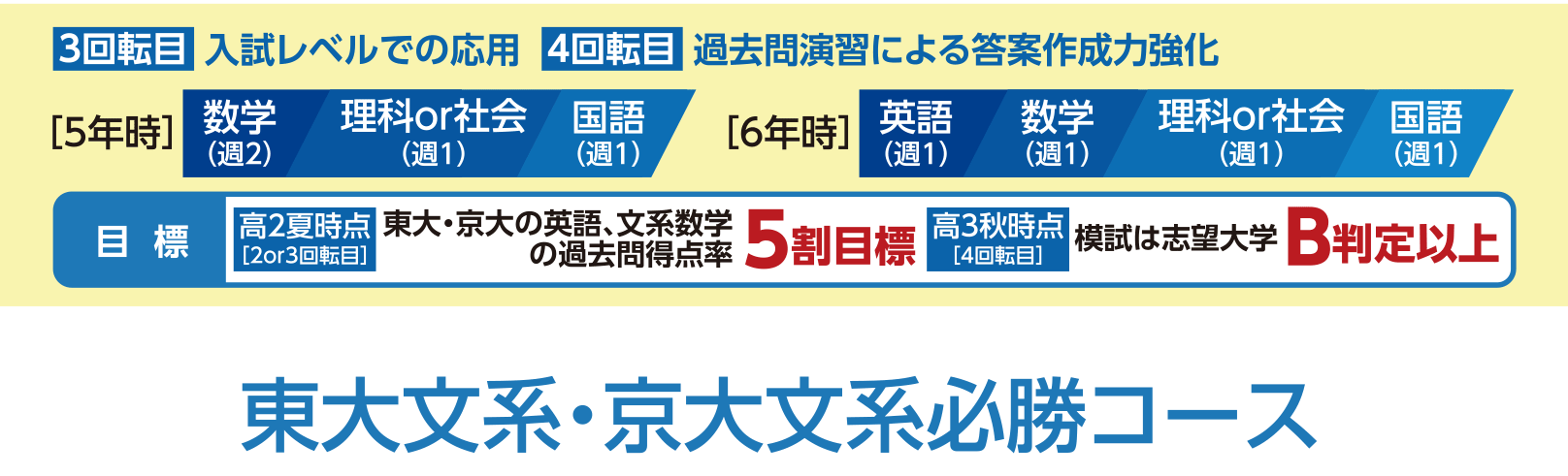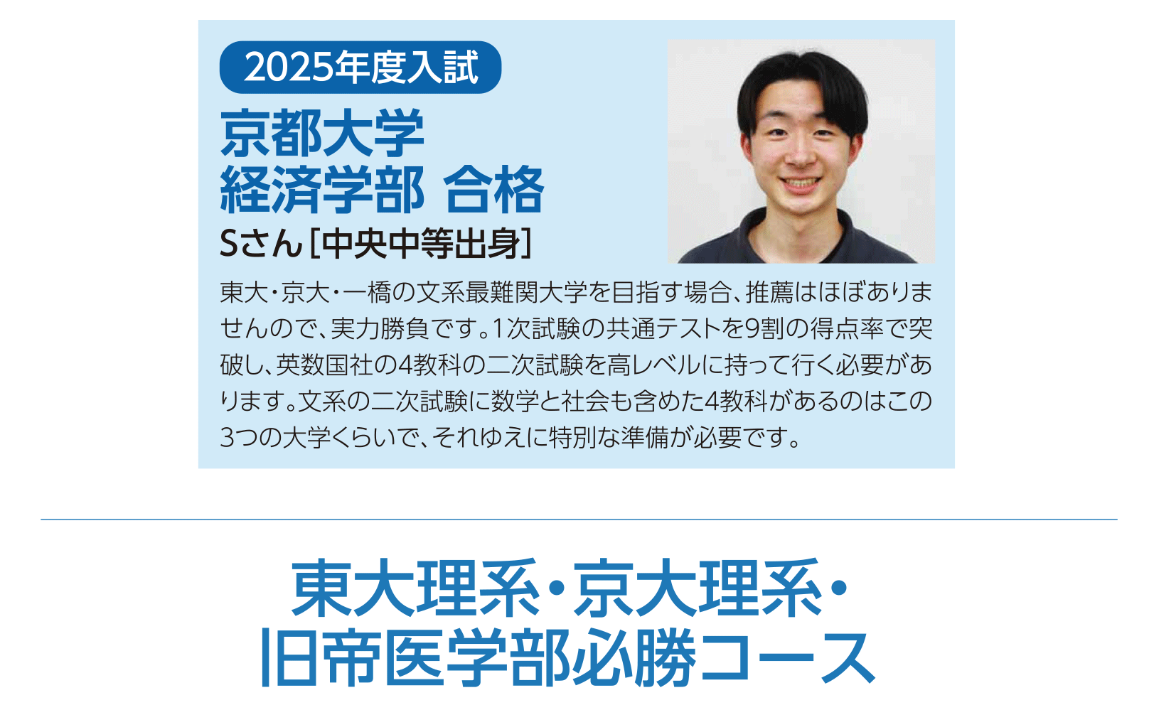 高2の4月時点で共通テスト英数国で75%を目指しましょう。夏合宿では東大・京大チャレンジがあり、高3生と一緒に過去問演習をしながら、専任講師による記述添削指導を1対1で受けられます。記述模試を見据えた添削指導と、最終日の面談は成績向上に「確実につながり」ます。高3では、夏合宿で志望校の過去問演習に取り組み、添削指導を通して現在の実力を測り、今後の過去問演習につながる面談指導をおこないます。