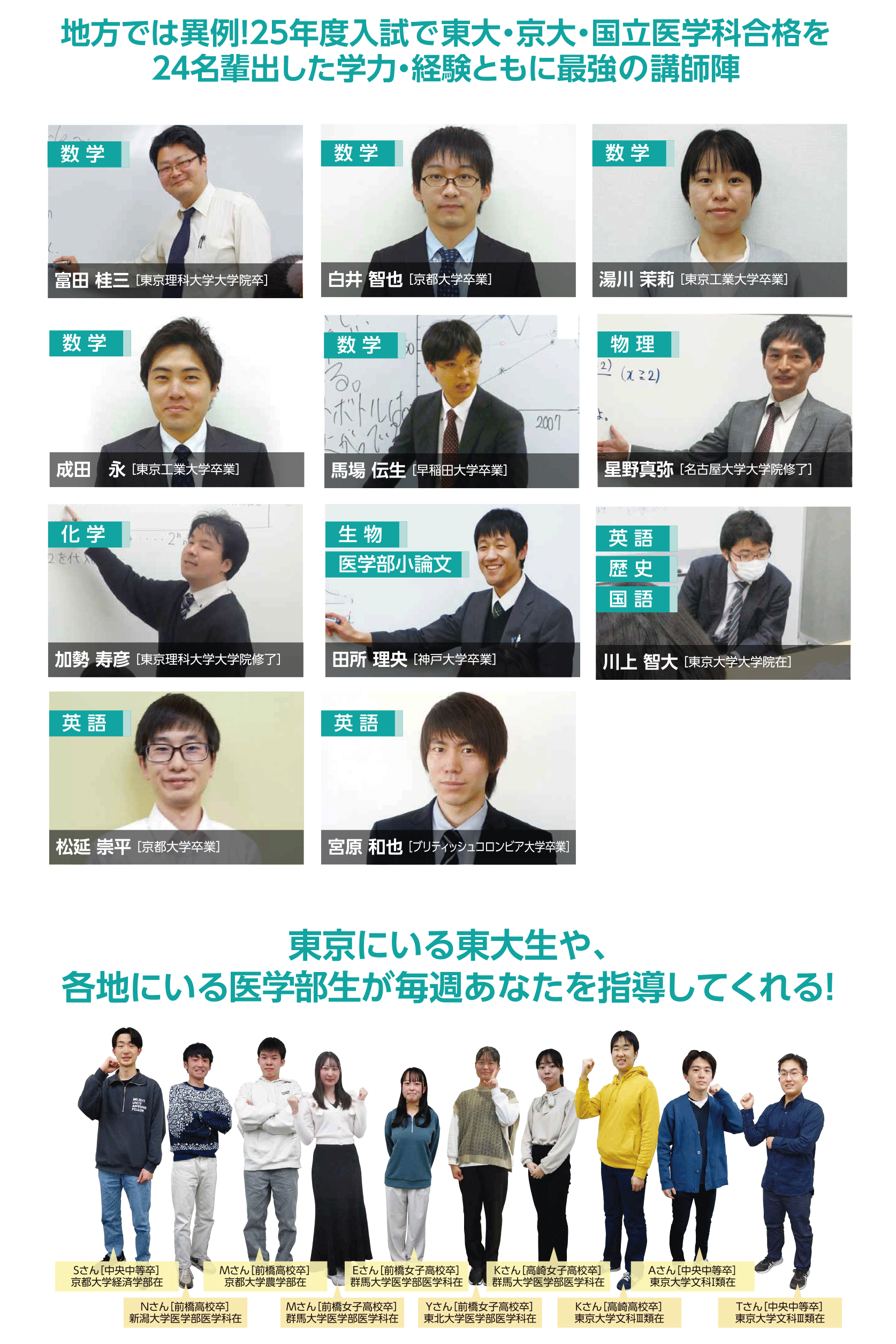 精鋭講師陣と東大生・医学生の卒業生で、5教科プラス小論文までトータル指導