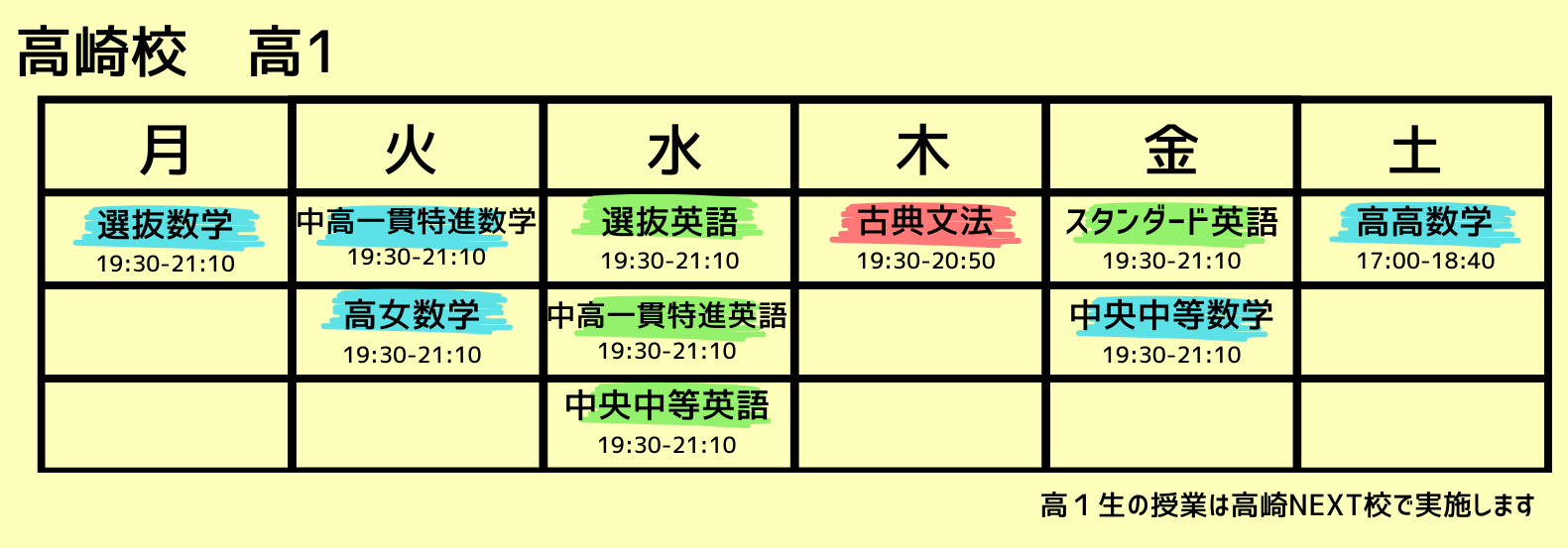 高崎校水曜日 19:30~21:10前橋校土曜日 19:20~21:00